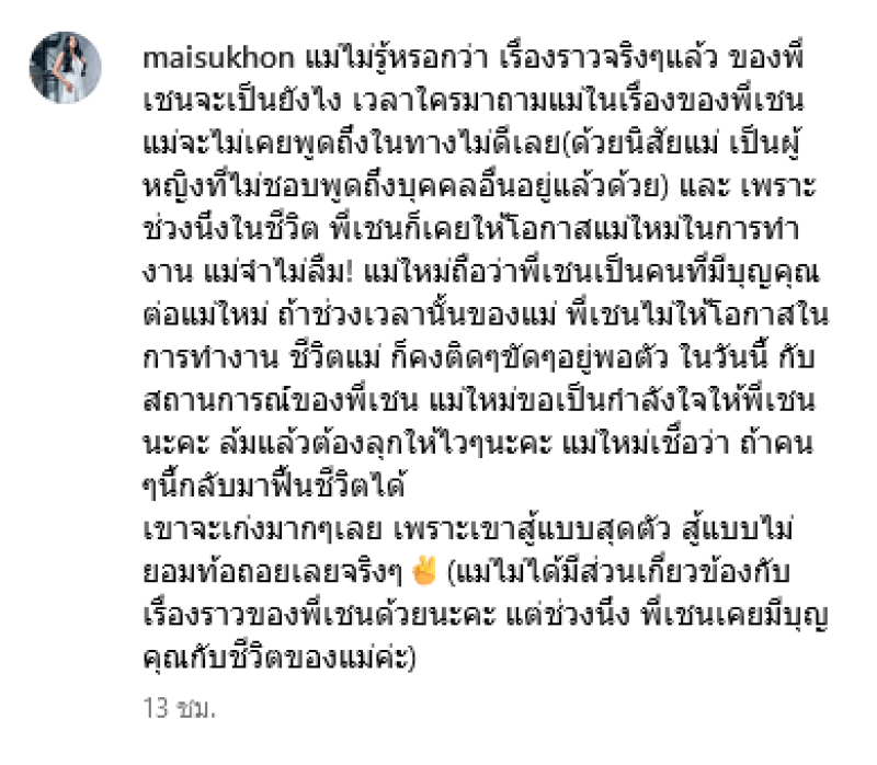 (ด้วยนิสัยแม่ เป็นผู้หญิงที่ไม่ชอบพูดถึงบุคคลอื่นอยู่แล้วด้วย) และ เพราะช่วงนึงในชีวิต พี่เชนก็เคยให้โอกาสแม่ใหม่ในการทำงาน แม่จำไม่ลืม! แม่ใหม่ถือว่าพี่เชนเป็นคนที่มีบุญคุณต่อแม่ใหม่ ถ้าช่วงเวลานั้นของแม่ พี่เชนไม่ให้โอกาสในการทำงาน ชีวิตแม่ ก็คงติดๆขัดๆอยู่พอตัว ในวันนี้ กับสถานการณ์ของพี่เชน แม่ใหม่ขอเป็นกำลังใจให้พี่เชนนะคะ ล้มแล้วต้องลุกให้ไวๆนะคะ