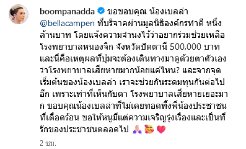 เรียกได้ว่าเป็นนางเอกที่นอกจากจะสายบุญเเล้วยังช่วยเหลือประชาชนในด้านต่างๆอีกด้วยสำหรับ เบลล่า ราณี ล่าสุดได้บริจาคเงินช่วยเหลือผู้ประสบภัยน้ำท่วมให้กับทาง บุ๋ม ปนัดดา ประธานมูลนิธิองค์กรทำดี โดยได้โพสต์ขอบคุณ เบลล่า ผ่านอินสตาแกรม พร้อมเขียนข้อความว่า ขอขอบคุณ น้องเบลล่า ที่บริจาคผ่านมูลนิธิองค์กรทำดี หนึ่งล้านบาท โดยแจ้งความจำนงไว้ว่าอยากร่วมช่วยเหลือโรงพยาบาลหนองจิก จังหวัดปัตตานี 500,000 บาท