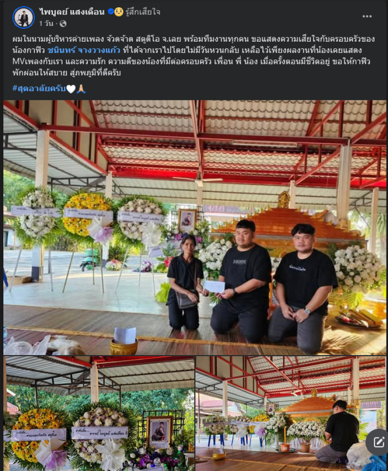 จากกรณีที่ก่อนหน้านี้ นายไพบูลย์ แสงเดือน หรือครูไพบูลย์ เจ้าของฉายา กงยูเมืองไทย โพสต์ภาพและข้อความผ่านเฟซบุ๊ก ไพบูลย์ แสงเดือน ว่า ผู้บริหารค่ายเพลง จ้วดจ้าด สตูดิโอ จ.เลย พร้อมทีมงานทุกคน ขอแสดงความเสียใจกับครอบครัวของน้องกาฟิว ชนินทร์ จางวางแก้ว ที่ได้จากเราไปโดยไม่มีวันหวนกลับ เหลือไว้เพียงผลงานที่น้องเคยแสดง MV เพลงกับเรา และความรัก ความดีของน้องที่มีต่อครอบครัว เพื่อน พี่ น้อง เมื่อครั้งตอนมีชีวิตอยู่ ขอให้กาฟิวพักผ่อนให้สบาย สู่ภพภูมิที่ดีครับ #สุดอาลัยครับ