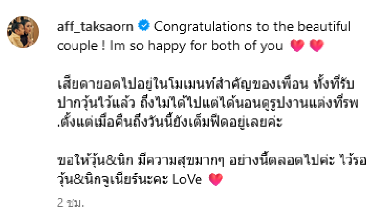 โดย แอฟ ทักษอร ได้บอกเหตุผลผ่านทาง อินสตาแกรม พร้อมทั้งโพสต์ภาพงานแต่งวุ้นนเส้น รวมถึงบอกถึงสาเหตุที่ไม่ได้ไปว่า Congratulations to the beautiful couple ! Im so happy for both of you เสียดายอดไปอยู่ในโมเมนท์สำคัญของเพื่อน ทั้งที่รับปากวุ้นเส้นไว้แล้ว ถึงไม่ได้ไปแต่ได้นอนดูรูปงานแต่งที่รพ.ตั้งแต่เมื่อคืนถึงวันนี้ยังเต็มฟีดอยู่เลยค่ะ ขอให้วุ้นเส้น&นิกม์ มีความสุขมากๆ อย่างนี้ตลอดไปค่ะ ไว้รอวุ้นเส้น&นิกจูเนียร์นะคะ LoVe ซึ่งสาเหตุที่ไม่ได้เนื่องจาก แอฟ ทักษอร กับ น้องปีใหม่ ได้ป่วยพร้อมกัน2คน