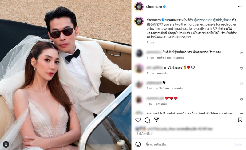 ล่าสุด พลอย เฌอมาลย์ เพื่อนคนสนิทอีกคนของวุ้นเส้น ได้โพสต์ร่วมยินดี หลังไม่ได้ไปร่วมงานแต่ง โดยได้เผยว่า ขอแสดงความยินดีกับ @vjwoonsen @nick_thana ทั้งสองคนนะจ๊ะ you are two the most perfect people for each other enjoy the love and happiness for eternity na ja ตั้งใจจะไปแสดงความยินดี ตัดชุดไปงานแล้ว แต่ไม่สบายเลยไม่ได้ไปร่วมยินดีด้วย ขอให้ทั้งสองคนมีความสุขมากๆนะ