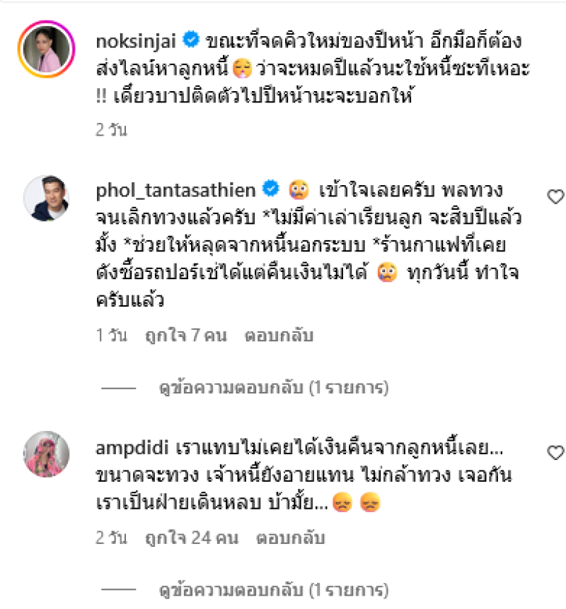 ทั้งนี้ แอม เสาวลักษณ์ ลีละบุตร คอมเมนต์บอกว่า เราแทบไม่เคยได้เงินคืนจากลูกหนี้เลย... ขนาดจะทวง เจ้าหนี้ยังอายแทน ไม่กล้าทวง เจอกันเราเป็นฝ่ายเดินหลบ บ้ามั้ย
