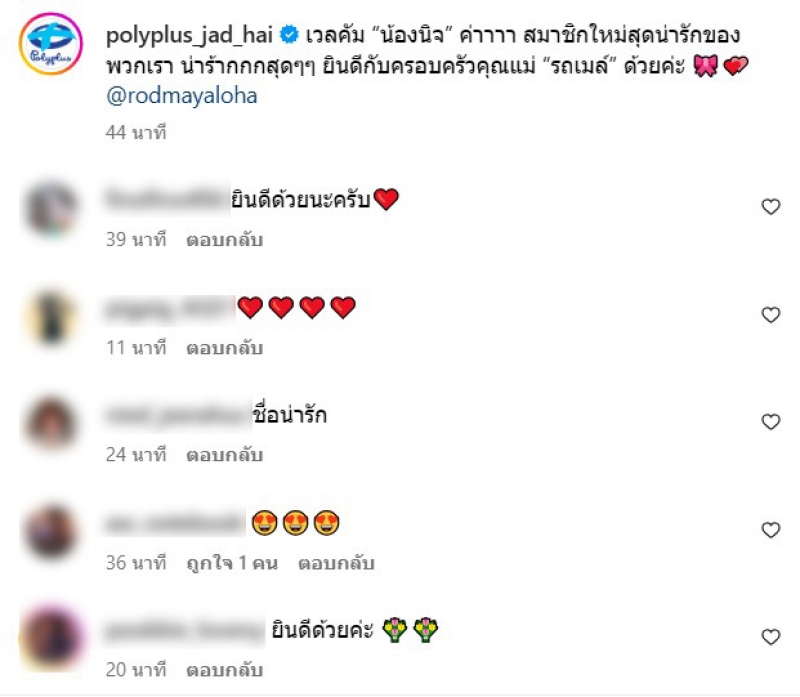 ขอแสดงความยินดีด้วนะคะ เมื่อล่าสุดทางเพจ polyplus_jad_hai ได้ออกมาเผย รถเมล์ คะนึงนิจ ได้คลอดลูกแล้ว โดยได้โพสต์ว่า เวลคัม “น้องนิจ” ค่าาาา สมาชิกใหม่สุดน่ารักของพวกเรา น่าร้ากกกสุดๆๆ ยินดีกับครอบครัวคุณแม่ “รถเมล์” ด้วยค่ะ