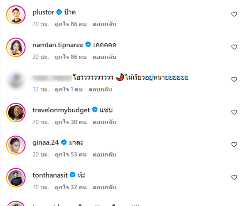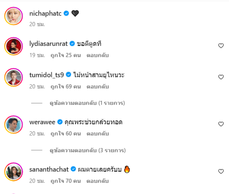 ท่ามกลาง เหล่าเพื่อนๆในวงการและแฟนคลับเข้ามาคอมเมนต์กันจำนวนมาก เช่น ไม้หน้าสามยุไหนวะ,คุณพระช่วยกล้วยทอด,ผมตายเลยครับบ ,โอวววววววววว ไม้เรียวอยู่หนายยยยยย,แซ่บลืมเลยจ้า,ไม้เรียวอยุ่หนายยยยยย เป็นต้น