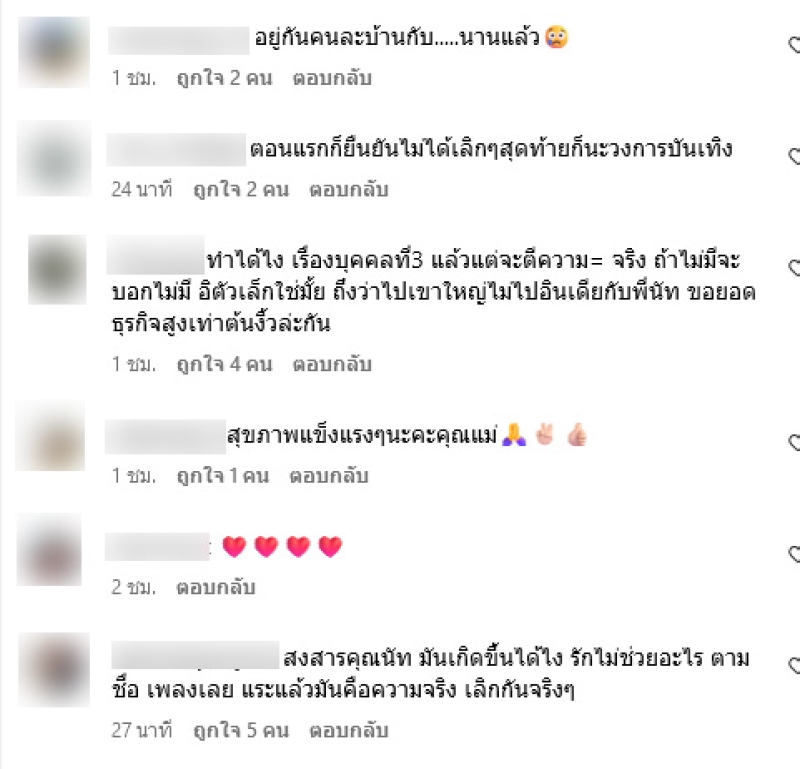 ถ้าให้พูด ณ วันนี้ นัทก็ขออนุญาตแจ้งให้ทุกคนทราบนะคะ นัทได้ยุติความสัมพันธ์กับคุณอั้มแล้ว หมายถึงยุติในความเป็นสามีภรรยา แต่ยังเป็นเพื่อนกันค่ะ ไม่ขอตอบถึงสาเหตุ แต่ชีวิตคู่มีหลายปัจจัย จบกันด้วยดี ด้วยการพูดคุยที่โอเค ตกลงด้วยกันทั้งคู่ค่ะ แต่ไม่ขอลงรายละเอียดนะคะ เรื่องราวเกิดขึ้นสักพักแล้วค่ะ