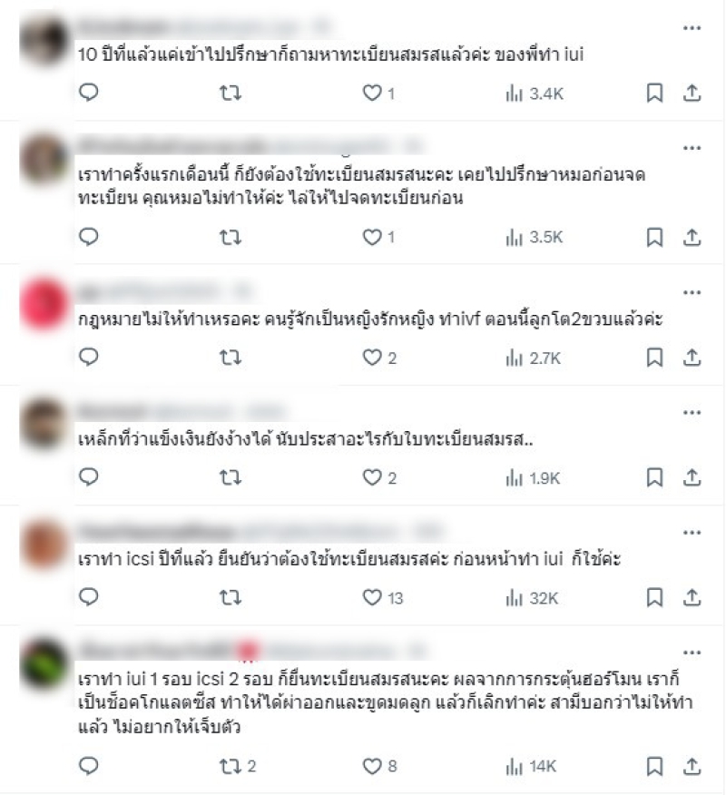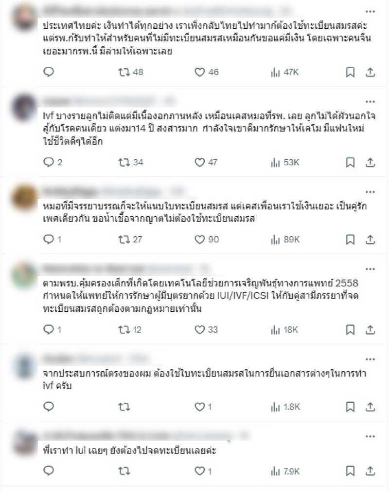 และด้านชาวเน็ตคนอื่นๆก็ได้มาตอบ เช่น เท่าที่อ่านก็คือ คนไม่มีเงินก็ทําตามกฎไป คนมีเงินก็ไม่ต้องทําตามกฎ จริง ๆ คง บวกกับจรรยาบรรณของคนทํางานด้วยแหละ,อะไรที่เกี่ยวกับทําลูกต้องใช้ใบทะเบียนสมรสด้วย ขนาดฝากไข่ไว้ตอนจะใช้ไข่ยังต้อง ใช้ทะเบียนสมรสไปยื่น,อุ๊ย ที่เคยทํางานคือไม่มีทะเบียนนี่ไม่ได้เลยนะ แต่บางที่ดังๆ ก็ไม่เรียกดูจากคนไข้ ด้วย ถ้ากระทรวงตรวจสอบคือบึ้มมมมมมม,ทางนี้ท่า iui 2 รอบ icsi 1 รอบ รพ.ขอทะเบียนสมรสตั้งแต่ครั้งแรกที่ไปปรึกษาหมอเลย พอย้ายไปทํา icsi อีกคลีนิกนึง ก็โดนเรียกทะเบียนสมรสอีกรอบนึง เป็นต้น