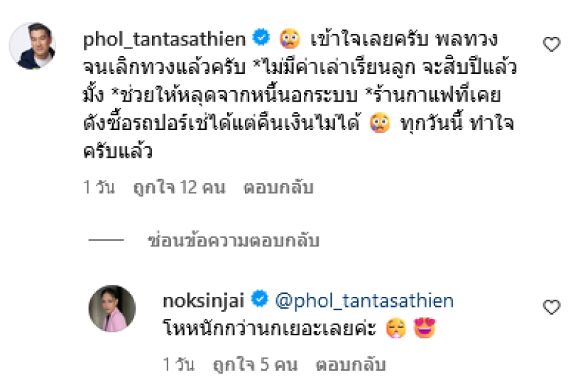 โดยทางด้าน พล ตัณฑเสถียร ก็ได้มีการเข้ามาคอมเมนต์ถึงลูกหนี้ของตนเช่นกันว่า เข้าใจเลยครับ พล ทวงจนเลิกทวงแล้วครับ ไม่มีค่าเล่าเรียนลูก จะสิบปีแล้วมั้ง ช่วยให้หลุดจากหนี้นอกระบบ ร้านกาแฟที่เคยดังซื้อรถปอร์เช่ได้แต่คืนเงินไม่ได้ ทุกวันนี้ ทำใจครับแล้ว ซึ่ง นก สินจัย ได้ตอบกลับว่า โหหนักกว่านกเยอะเลยค่ะ