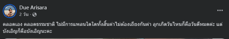 ล่าสุด ดิว อริสรา ได้ออกมาโพสต์ชี้แจงถึงประเด็นดังกล่าวผ่านเฟซบุ๊ค Due Arisara โดยเขียนข้อความว่า คลอดเอง คลอดธรรมชาติ ไม่มีการแพลนใดใดทั้งสิ้นค่าไม่ต้องเถียงกันค่า ลูกเกิดวันไหนก็คือวันดีหมดค่ะ แต่บังเอิญก็คือบังเอิญนะคะ