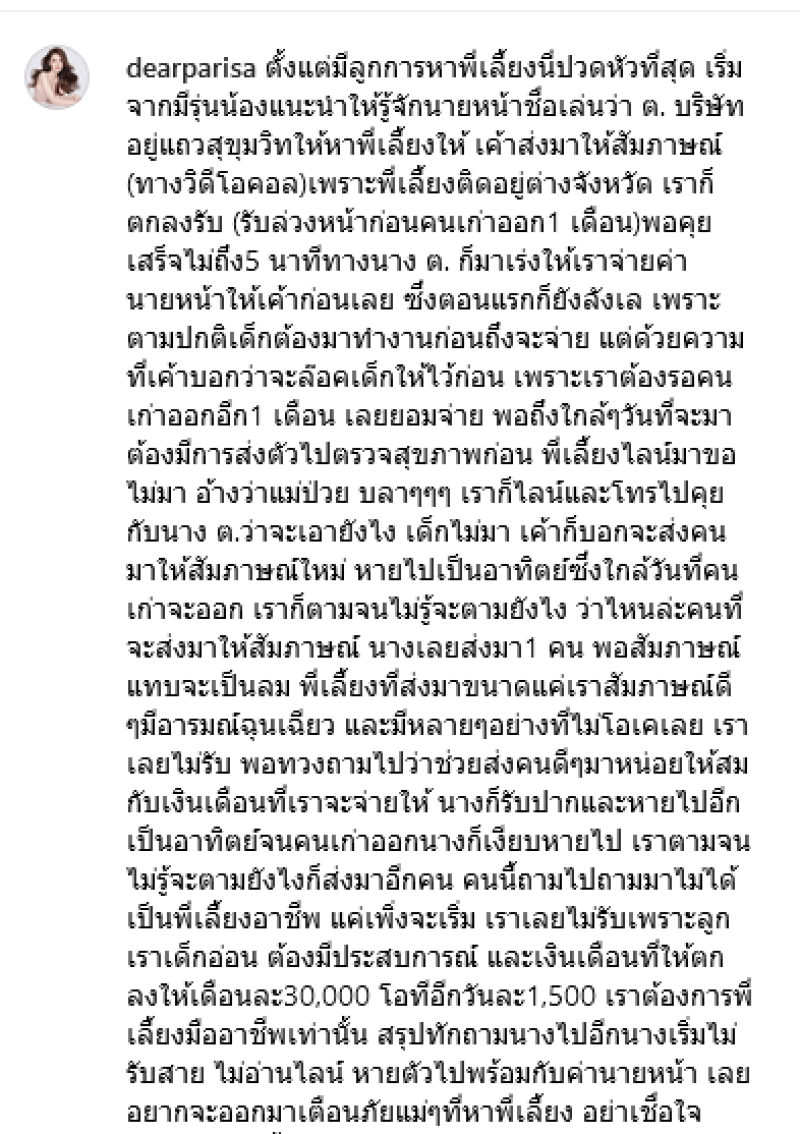 นางก็รับปากและหายไปอีกเป็นอาทิตย์จนคนเก่าออกนางก็เงียบหายไป เราตามจนไม่รู้จะตามยังไงก็ส่งมาอีกคน คนนี้ถามไปถามมาไม่ได้เป็นพี่เลี้ยงอาชีพ แค่เพิ่งจะเริ่ม เราเลยไม่รับเพราะลูกเราเด็กอ่อน ต้องมีประสบการณ์ และเงินเดือนที่ให้ตกลงให้เดือนละ30,000 โอทีอีกวันละ1,500 เราต้องการพี่เลี้ยงมืออาชีพเท่านั้น สรุปทักถามนางไปอีกนางเริ่มไม่รับสาย ไม่อ่านไลน์ หายตัวไปพร้อมกับค่านายหน้า เลยอยากจะออกมาเตือนภัยแม่ๆที่หาพี่เลี้ยง