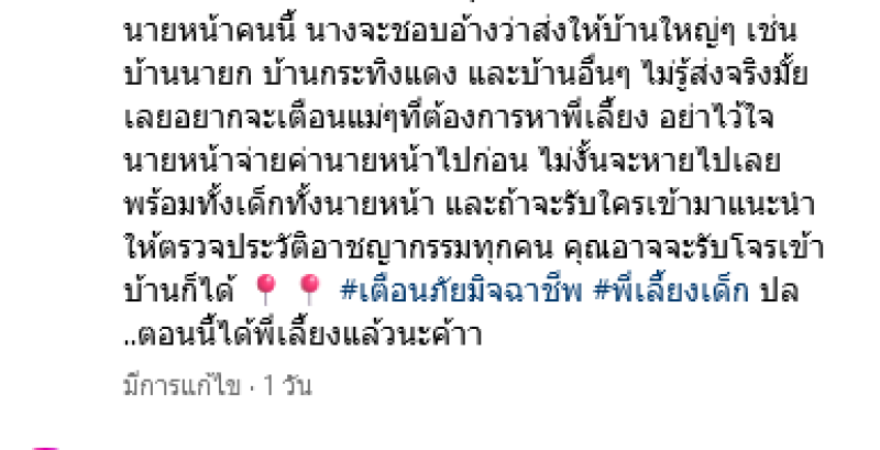 อย่าเชื่อใจนายหน้าคนนี้ นางจะชอบอ้างว่าส่งให้บ้านใหญ่ๆ เช่นบ้านนายก บ้านกระทิงแดง และบ้านอื่นๆ ไม่รู้ส่งจริงมั้ย เลยอยากจะเตือนแม่ๆที่ต้องการหาพี่เลี้ยง อย่าไว้ใจนายหน้าจ่ายค่านายหน้าไปก่อน ไม่งั้นจะหายไปเลยพร้อมทั้งเด็กทั้งนายหน้า และถ้าจะรับใครเข้ามาแนะนำให้ตรวจประวัติอาชญากรรมทุกคน คุณอาจจะรับโจรเข้าบ้านก็ได้ #เตือนภัยมิจฉาชีพ #พี่เลี้ยงเด็ก ปล..ตอนนี้ได้พี่เลี้ยงแล้วนะค้าา