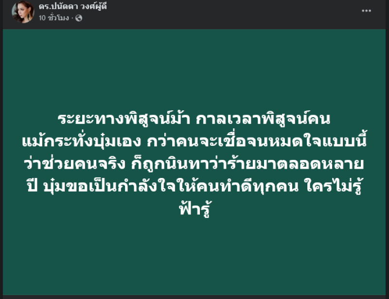 ล่าสุด บุ๋ม ปนัดดา ได้โพสต์ข้อความผ่านเฟซบุ๊คส่วนตัว ดร.ปนัดดา วงศ์ผู้ดี พร้อมเขียนข้อความว่า ระยะทางพิสูจน์ม้า กาลเวลาพิสูจน์คน แม้กระทั่งบุ๋มเอง กว่าคนจะเชื่อจนหมดใจแบบนี้ ว่าช่วยคนจริง ก็ถูกนินทาว่าร้ายมาตลอดหลายปี บุ๋มขอเป็นกำลังใจให้คนทำดีทุกคน ใครไม่รู้ ฟ้ารู้ ท่ามกลางชาวเน็ตเข้ามาคอมเมนต์ชื่นชมกันอย่างมาก