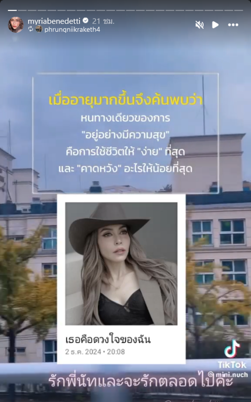โดย นัท มีเรีย ได้แชร์โพสต์คำคมผ่านสตอรี่ ไอจี ว่า เมื่ออายุมากขึ้นจึงค้นพบว่า หนทางเดียวของการอยู่อย่างมีความสุข คือการใช้ชีวิตให้ง่ายที่สุด และ คาดหวัง อะไรให้น้อยที่สุด