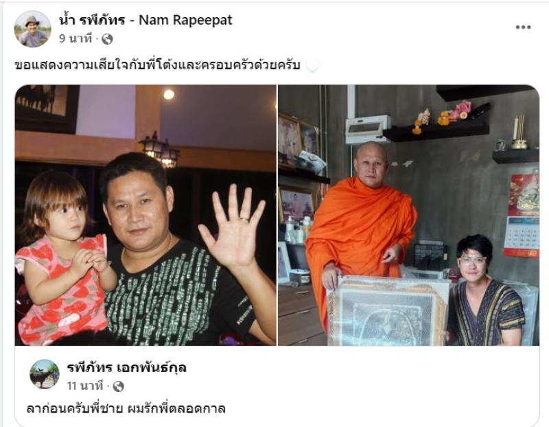 ล่าสุด อดีตพระเอกดัง อย่าง น้ำ รพีภัทร ได้โพสต์อาลัย สจ.โต้ง โดยได้ระบุข้อความว่า ลาก่อนครับพี่ชาย ผมรักพี่ตลอดกาล ท่ามกลาง ชาวเน็ตเข้ามาแสดงความเสียใจกันจำนวนมาก