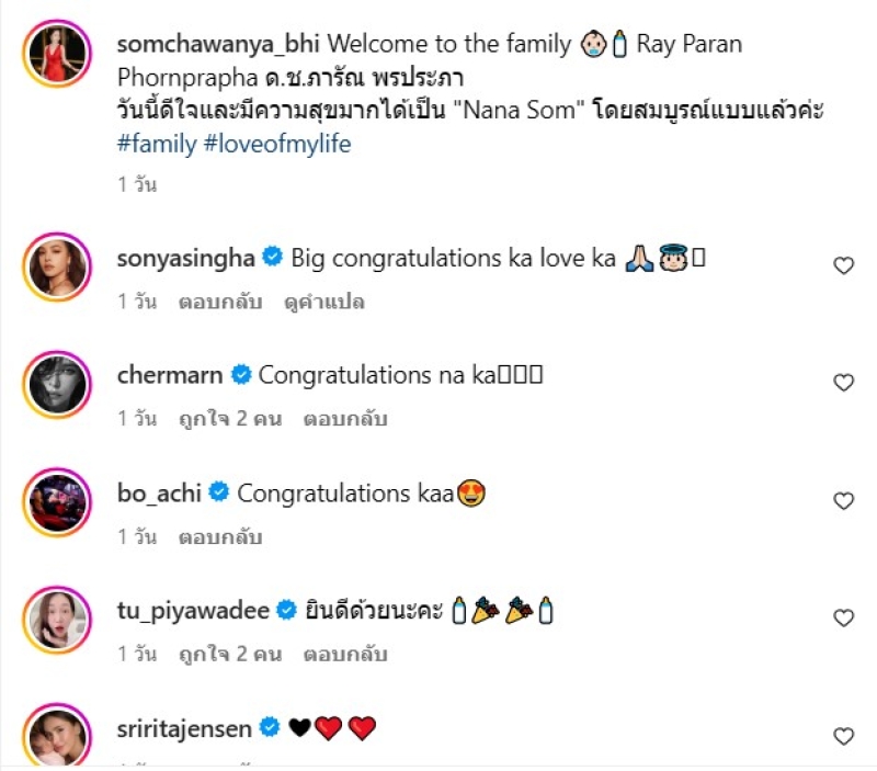 ขอแสดงความยินดีด้วยจ้า เมื่อล่าสุด แพร พิมพิศา พี่สาวของ พีช พชร ได้คลอดทายาทของตระกูลแล้ว โดยทางสามี คุณประภู พรประภา ก็อยู่เคียงข้างภรรยาตลอด โดยได้เผยข้อความว่า Welcome to the family Ray Paran Phornprapha ด.ช.ภารัณ พรประภา วันนี้ดีใจและมีความสุขมากได้เป็น "Nana Som" โดยสมบูรณ์แบบแล้วค่ะ #family #loveofmylife