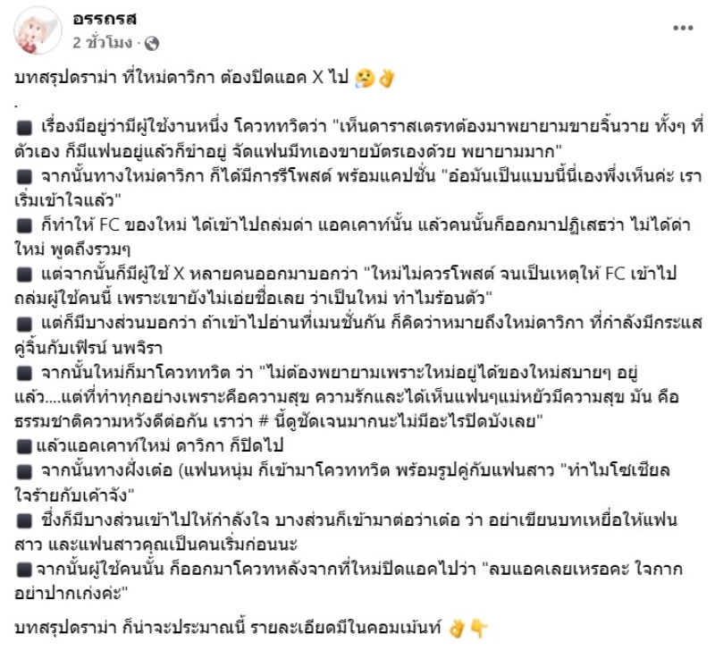 จากกรณีที่ก่อนหน้านั้น ได้มีดราม่าสนั่นเกี่ยวกับ ใหม่ ดาวิกา โดยล่าสุดทางเพจ อรรถรส ได้ออกมาสรุปว่า บทสรุปดราม่า ที่ใหม่ดาวิกา ต้องปิดแอค X ไป