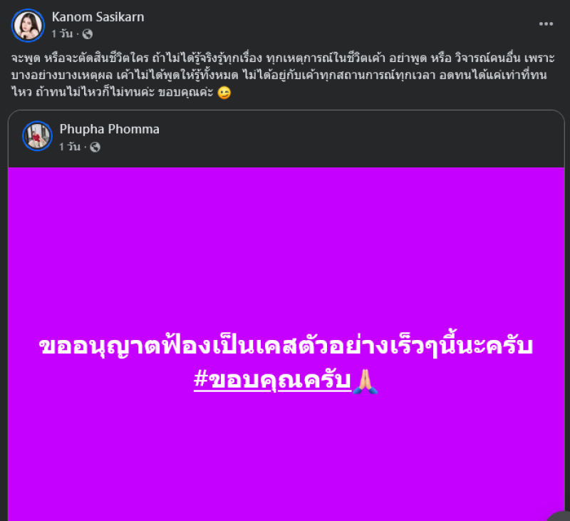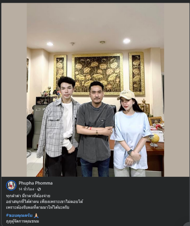 ต่อมาทางด้านผู้จัดการส่วนตัว ขนม ได้โพสต์ภาพร่วมเฟรม ทนายเจมส์ พร้อมข้อความระบุว่า ทุกคำด่า มีราคาที่ต้องจ่าย อย่าสนุกที่ได้ด่าคน เพียงเพราะเขาไม่ตอบโต้ เพราะต้องรับผลที่ตามมาให้ได้นะครับ #ขอบคุณครับ ภูภูผู้จัดการคุณขนม ทั้งนี้ ขนม ได้แชร์ และคอมเมนต์บอกว่า ขอบคุณค่ะ