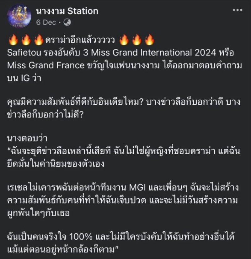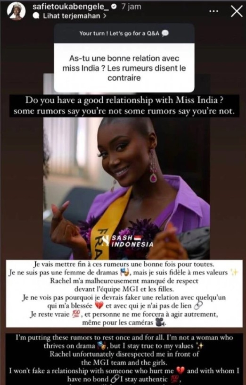 จากกรณีที่ก่อนหน้านั้น ได้มีประเด็นร้อนที่แฟนนางงามจับตามอง หลังมิสแกรนด์ฝรั่งเศส ซาฟีตู กาเบนเกเล โพสต์ไอจีตอรี่ตอบคำถาม เกี่ยวกับความสัมพันธ์ของเธอกับ ราเชล คุปตา มิสแกรนด์อินเตอร์เนชั่นแนล 2024 โดยบอกว่าราเชลไม่เคารพตนต่อหน้าทีมงาน MGI จึงจะไม่สร้างความสัมพันธ์ใดๆ กับคนที่ทำให้เจ็บปวด พร้อมเผยว่าตอนนี้ยังคงติดต่อกับ แตแต มิสแกรนด์เมียนมา และจะพาอีกฝ่ายมาเที่ยวฝรั่งเศสด้วย ซึ่งงานนี้หลายคนมองว่า เป็นการไม่ให้เกียรติทั้ง ราเชล และ ณวัฒน์ อิสรไกรศีล บอสใหญ่ของเวทีมิสแกรนด์ เนื่องจากเจ้าตัวก็รับรู้ ว่าทางมิสแกรนด์เมียนมา มีประเด็นกับทางองค์กรอยู่