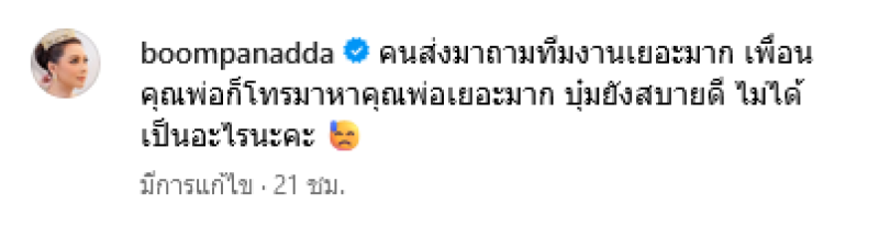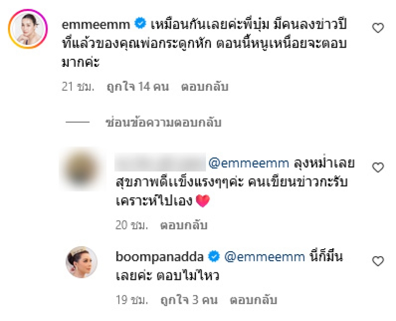ต่อมาทางด้าน เอ็ม บุษราคัม ลูกสาวคนโตของนนักแสดงตลกอย่าง หม่ำ จ๊กมก ได้เข้ามาคอมเมนต์โพสต์ของ บุ๋ม ปนัดดา ว่า เหมือนกันเลยค่ะพี่บุ๋ม มีคนลงข่าวปีที่แล้วของคุณพ่อกระดูกหัก ตอนนี้หนูเหนื่อยจะตอบมากค่ะ ทั้งนี้ บุ๋ม ได้เข้ามาตอบกลับว่า นี่ก็มึนเลยค่ะ ตอบไม่ไหว