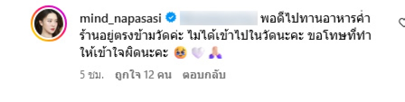 ล่าสุดทางด้าน มายด์ ณภศศิ ได้เข้ามาตอบกลับคอมเมนต์ที่ได้วิจารณ์ถึงชุดที่ใส่เข้าวัด โดย มายด์ ได้เผยว่า พอดีไปทานอาหารร้านอยู่ตรงข้ามวัดค่ะ ไม่ได้เข้าวัดนะคะ งือ ขอบคุณนะคะ ขอโทษที่ทำให้เข้าใจผิดค่ะ