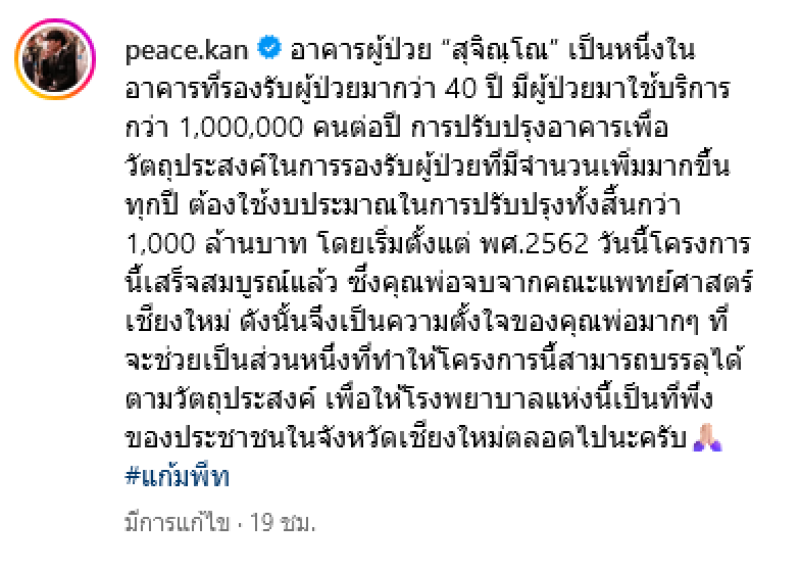 โดยเริ่มตั้งแต่ พศ.2562 วันนี้โครงการนี้เสร็จสมบูรณ์แล้ว ซึ่งคุณพ่อจบจากคณะแพทย์ศาสตร์ เชียงใหม่ ดังนั้นจึงเป็นความตั้งใจของคุณพ่อมากๆ ที่จะช่วยเป็นส่วนหนึ่งที่ทำให้โครงการนี้สามารถบรรลุได้ตามวัตถุประสงค์ เพื่อให้โรงพยาบาลแห่งนี้เป็นที่พึ่งของประชาชนในจังหวัดเชียงใหม่ตลอดไปนะครับ #แก้มพีท