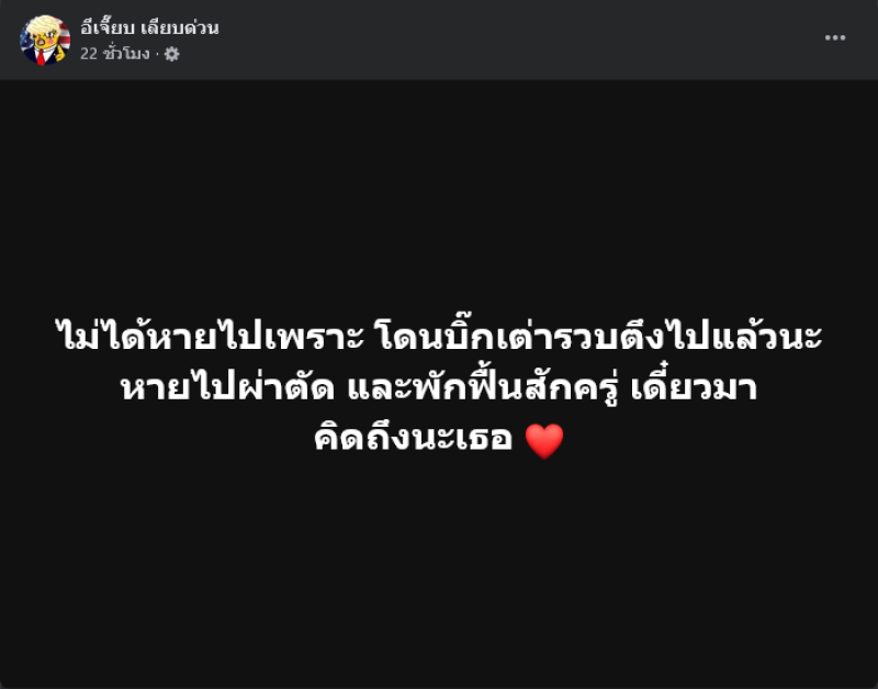 เรียกได้ว่าเป็นอีกหนึ่งเพจดังสำหรับ อีเจี๊ยบ เลียบด่วน ซึ่งล่าสุดได้กลับมาโพสต์อีกครั้งหลังหายไปนาน เนื่องจากว่าตนนั้นได้เข้ารับการผ่าตัด ซึ่งล่าสุดอาการก็ดีขึ้นเรื่อยๆ แล้ว โดยทางด้านเพจอีเจี๊ยบได้โพสต์ข้อความว่า ไม่ได้หายไปเพราะ โดนบิ๊กเต่ารวบตึงไปแล้วนะ หายไปผ่าตัด และพักฟื้นสักครู่ เดี๋ยวมา คิดถึงนะเธอ ดีขึ้นเรื่อยๆแล้วจ้า แต่อาจจะช้านิดนึง เพิ่งรู้ว่าร่างกายตอนอายุ24-25 มันฟื้นตัวช้า ไม่เหมือนตอน 16-17