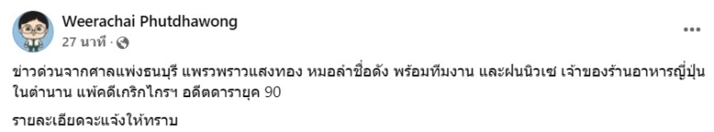 โดยทาง อาจารย์อ๊อด ได้ออกมาเผยผ่าน Weerachai Phutdhawong ว่า ข่าวด่วนจากศาลแพ่งธนบุรี แพรวพราวแสงทอง หมอลำชื่อดัง พร้อมทีมงาน และฝนนิวเซ เจ้าของร้านอาหารญี่ปุ่น ในตำนาน แพ้คดีเกริกไกรฯ อดีตดารายุค 90 รายละเอียดจะแจ้งให้ทราบ