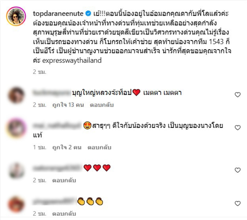 และอีกโพสต์ เย้!!!ตอนนี้น้องอยู่ในอ้อมอกคุณดากับพี่โลแล้วค่ะ ต้องขอบคุณน้องเจ้าหน้าที่ทางด่วนที่ทุ่มเทช่วยเหลืออย่างสุดกำลัง สุภาพบุรุษสี่ท่านที่ช่วยเราด้วยชุดสีเขียวเป็นวิศวกรทางด่วนคุณไม่รู้เรื่อง เห็นเป็นรถของทางด่วน ก็โบกรถให้เค้าช่วย สุดท้ายน้องจากทีม 1543 ก็เป็นฮีโร่ เป็นผู้ชำนาญงานช่วยออกมาจนสำเร็จ น่ารักที่สุดขอบคุณจากใจค่ะ expresswaythailand