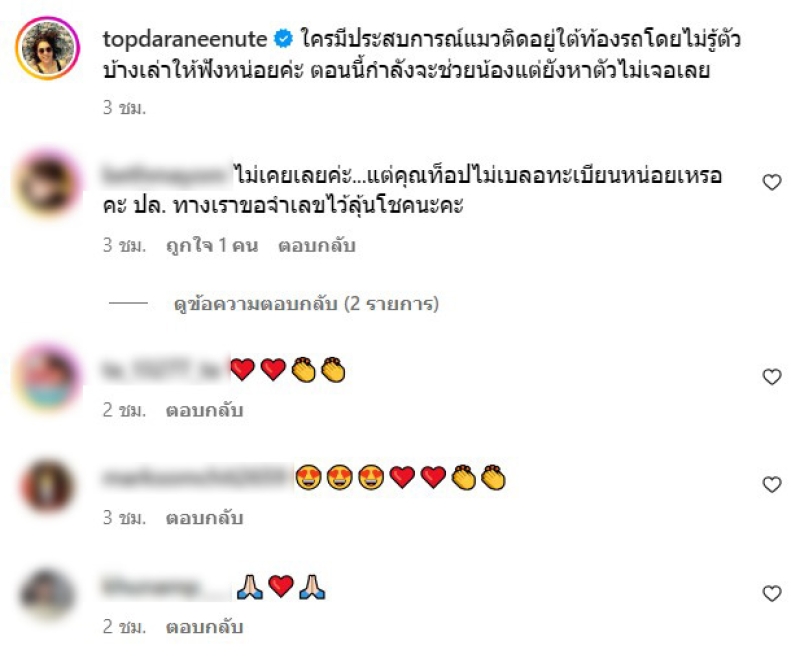 เรียกได้ว่า เป็นนักแสดงรุ่นใหญ่ อย่าง ท็อป ดารณีนุช ที่ล่าสุดเจ้าได้โพสต์คลิปที่ลุ้นระทึกมาก เมื่อมีเเมวติดอยู่ใต้ท้องรถ เเต่ยังหาตัวของเเมวไม่เจอ โดยโพสต์นี้ ท็อป ได้เผยว่า ใครมีประสบการณ์แมวติดอยู่ใต้ท้องรถโดยไม่รู้ตัวบ้างเล่าให้ฟังหน่อยค่ะ ตอนนี้กำลังจะช่วยน้องแต่ยังหาตัวไม่เจอเลย