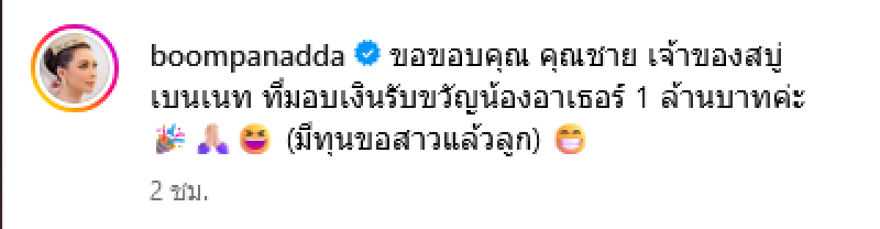 ล่าสุด บุ๋ม ปนัดดา ได้ลงภาพขอบคุณผู้ใหญ่ใจดีที่รับขวัญ น้องอาเธอร์ ผ่าน อินสตาแกรม โดยมีข้อความระบุว่า ขอขอบคุณ คุณชาย เจ้าของสบู่เบนเนท ที่มอบเงินรับขวัญน้องอาเธอร์ 1 ล้านบาทค่ะ (มีทุนขอสาวแล้วลูก) งานนี้ทำเอาหลายต่างเข้ามาคอมเมนต์กันอย่างมาก อาทิ ใช้สีส้มตลอดเลยคะ,แม่บุ๋มโชคดีจังเลยยินดีด้วยน๊า,ท่านใจดีมาก ให้คนก่อนแล้วให้คนนี้อีก เป็นต้น