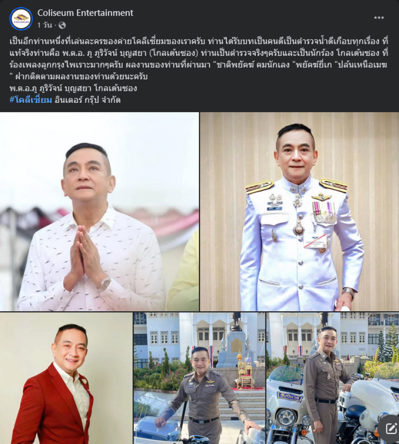 ท่านเป็นตำรวจจริงๆครับและเป็นนักร้อง โกลเด้นซอง ที่ร้องเพลงลูกกรุงไพเราะมากๆครับ ผลงานของท่านที่ผ่านมา ชาติพยัคฆ์ คมนักเลง พยัคฆ์ยี่เก ปล้นเหนือเมฆ ฝากติดตามผลงานของท่านด้วยนะครับ พ.ต.อ.ภู ภูริวัจน์ บุญสยา โกลเด้นซอง #โคลีเซี่ยม อินเตอร์ กรุ๊ป จำกัด