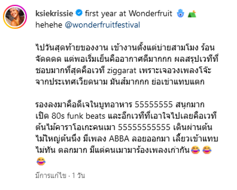 ทั้งนี้ คริสซี่ ได้ออกมาโพสต์ภาพยืนคู่กับหนุ่มหล่อในงาน Wonderfruit พร้อมลงแคปชั่นว่า first year at Wonderfruit hehehe ไปวันสุดท้ายของงาน เข้างานตั้งแต่บ่ายสามโมง ร้อนจัดดดด แต่พอเริ่มเย็นคืออากาศดีมาก ผลสรุปเวทีที่ชอบมากที่สุดคือเวที ziggarat เพราะเจอวงเพลงโจ๊ะจากประเทศเวียดนาม มันส์มาก ย่อเข่าแทบแตก รองลงมาคือดีเจในบูทอาหาร 55555555