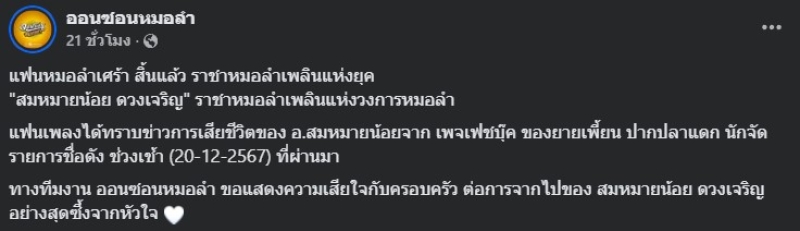ทำเศร้าทั้งวงการเพลงหมอลำกันเลยทีเดียว เมื่อมีทางด้านเพจ ออนซอนหมอลำ ได้ออกมาโพสต์ข้อความไว้อาลัยถึง ราชาหมอลำเพลิน สมหมายน้อย ดวงเจริญ ในวัย 58 ปี ได้เสียชีวิต พร้อมจากไปอย่างสงบ ณ ประเทศสหรัฐอเมริกา