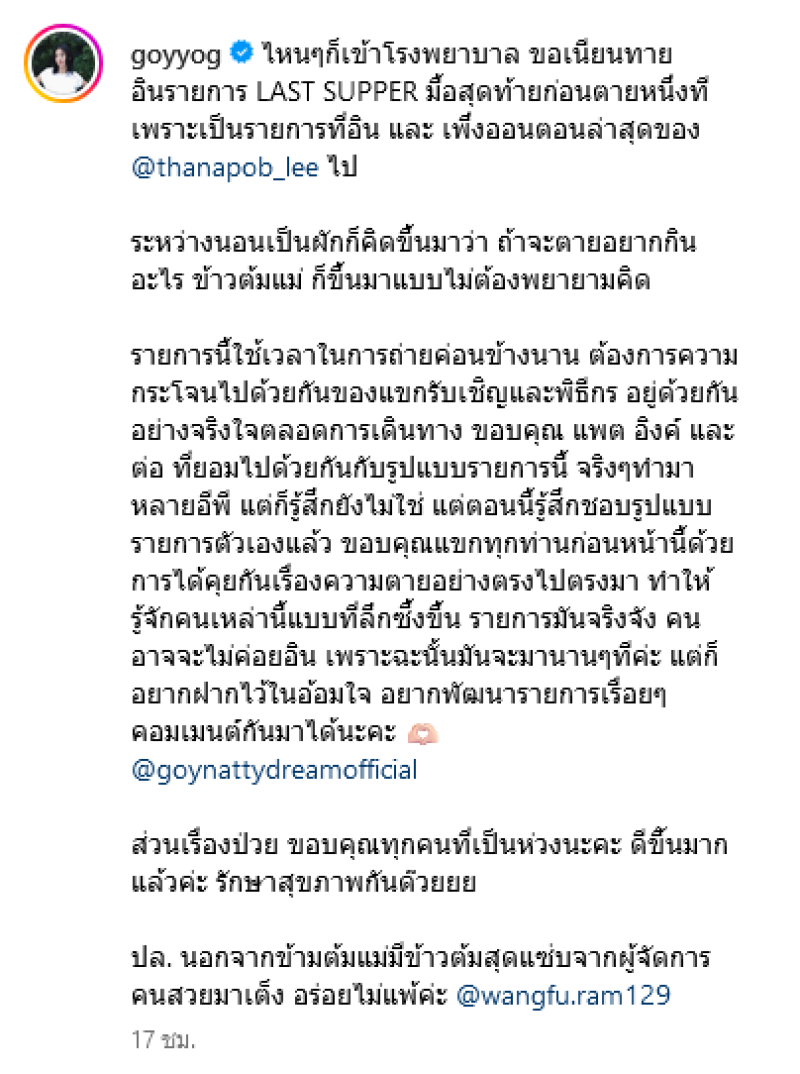 แต่ก็รู้สึกยังไม่ใช่ แต่ตอนนี้รู้สึกชอบรูปแบบรายการตัวเองแล้ว ขอบคุณแขกทุกท่านก่อนหน้านี้ด้วย การได้คุยกันเรื่องความตายอย่างตรงไปตรงมา ทำให้รู้จักคนเหล่านี้แบบที่ลึกซึ้งขึ้น รายการมันจริงจัง คนอาจจะไม่ค่อยอิน เพราะฉะนั้นมันจะมานานๆทีค่ะ แต่ก็อยากฝากไว้ในอ้อมใจ อยากพัฒนารายการเรื่อยๆ คอมเมนต์กันมาได้นะคะ ส่วนเรื่องป่วย ขอบคุณทุกคนที่เป็นห่วงนะคะ ดีขึันมากแล้วค่ะ รักษาสุขภาพกันด๊วยยย