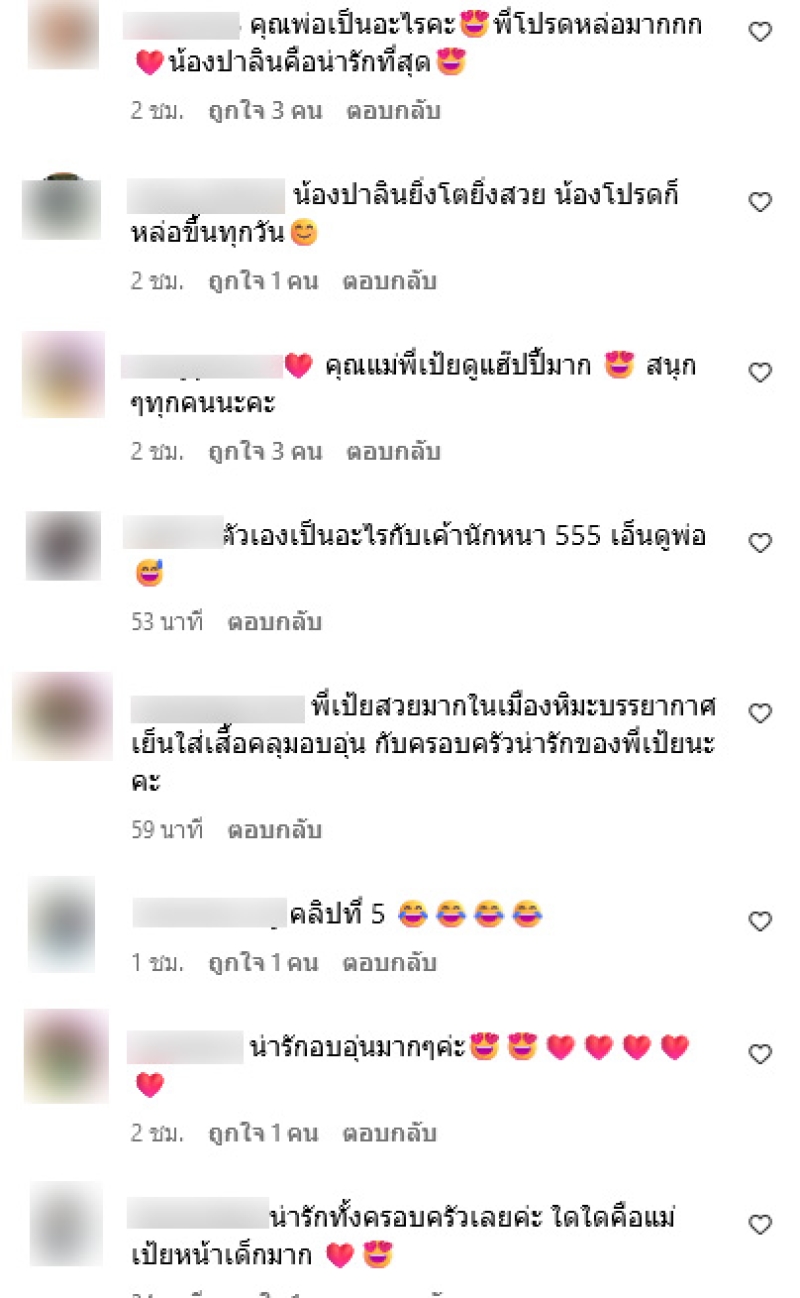 ท่ามกลางแฟนๆต่างเข้ามาคอมเมนต์ชื่นชมกันอย่างมาก อาทิ ตกลงอยากรู้ว่าเค้าเลิกกันแล้วหรือคะแต่ว่าก็ยังมาเที่ยวกับลูกอยู่,คุณพ่อเป็นอะไรคะ,พี่เป้ยสวยมากในเมืองหิมะบรรยากาศเย็นใส่เสื้อคลุมอบอุ่น กับครอบครัวน่ารักของพี่เป้ยนะคะ,น่ารักอบอุ่นมากๆค่ะ เป็นต้น
