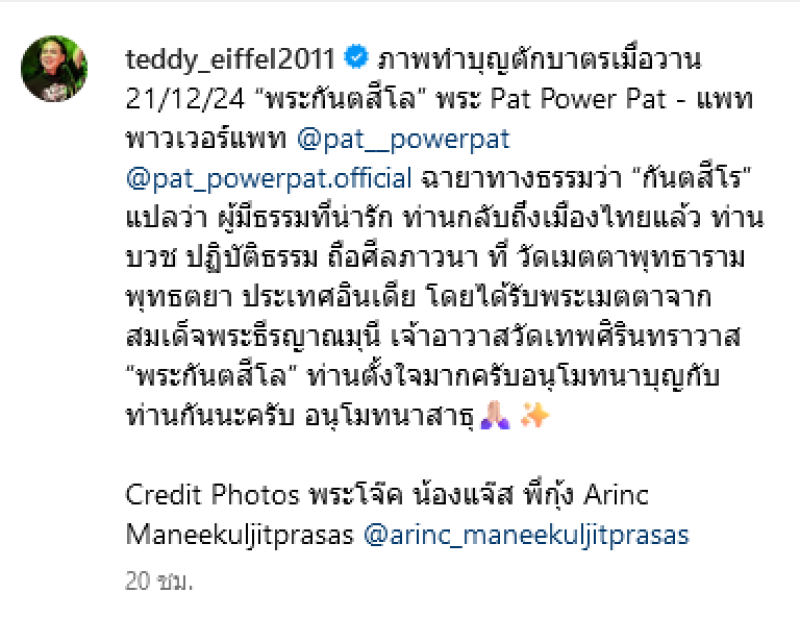 จากประเด็นที่ก่อนหน้านี้ แพท พาวเวอร์แพท ได้เดินทางไปบวชที่ประเทศอินเดียหลังจากบวชรอบ 2 เพื่อศึกษาธรรมะที่ประเทศอินเดียเมื่อช่วงต้นเดือนธันวาคม และมีกำหนดลาสิกขาในวันนี้ ( 22 ธ.ค. 67 ) ที่วัดเทพศิริทราวาสราชวรวิหาร โดย เท็ดดี้ ไอเฟล ได้เผยภาพล่าสุดของพระแพทหรือพระกันตสีโลที่ออกบิณฑบาต รวมทั้งภาพขณะปฏิบัติธรรมที่ประเทศอินเดีย ระบุแคปชั่นว่า
