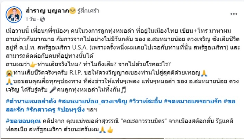 โดนได้ระบุข้อความร่วมอาลัย ราชาหมอลำดัง ว่า R.I.P. ขอแสดงความเสียใจอย่างสุดซึ้ง กับการจากไปของ อ.สมหมายน้อย ดวงเจริญ ตำนานกลอนลำดัง วิวาห์สะอื้น จดหมายบรรยายรัก และอีกมากมาย เสียชีวิตที่โรงพยาบาลแห่งหนึ่ง ในเมืองสกราเมนโต(Sacramento) รัฐแคลิฟอร์เนีย(California) สหรัฐอเมริกา(U.S.A.) ด้วยโรคเบาหวาน และเส้นเลือดในสมองแตก ของวันที่ 19 ธ.ค.นี้ 19 / 12 / 2024 เวลาประมาณ 18.00 น. ตามเวลาท้องถิ่น ขอให้ดวงวิญาณของท่านไปสู่สุคติ สู่ภพภูมิที่ดีด้วยเทอญ