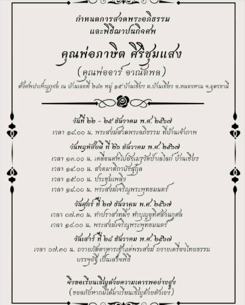 วันที่ 22-25 ธันวาคม 2567 เวลา 18.00 น. พระสงฆ์สวดพระอภิธรรม ที่บ้านเจ้าภาพ