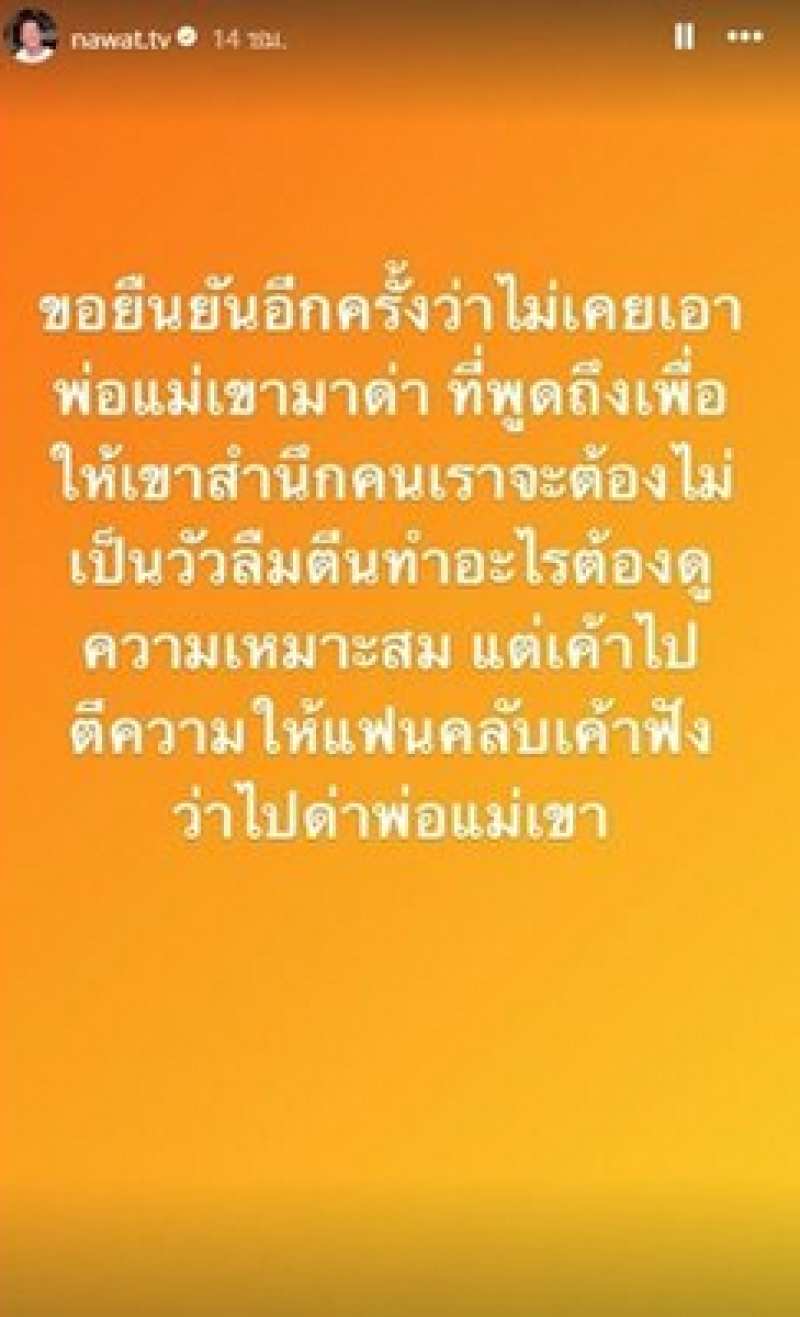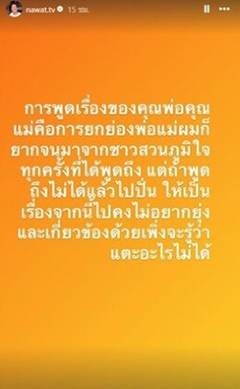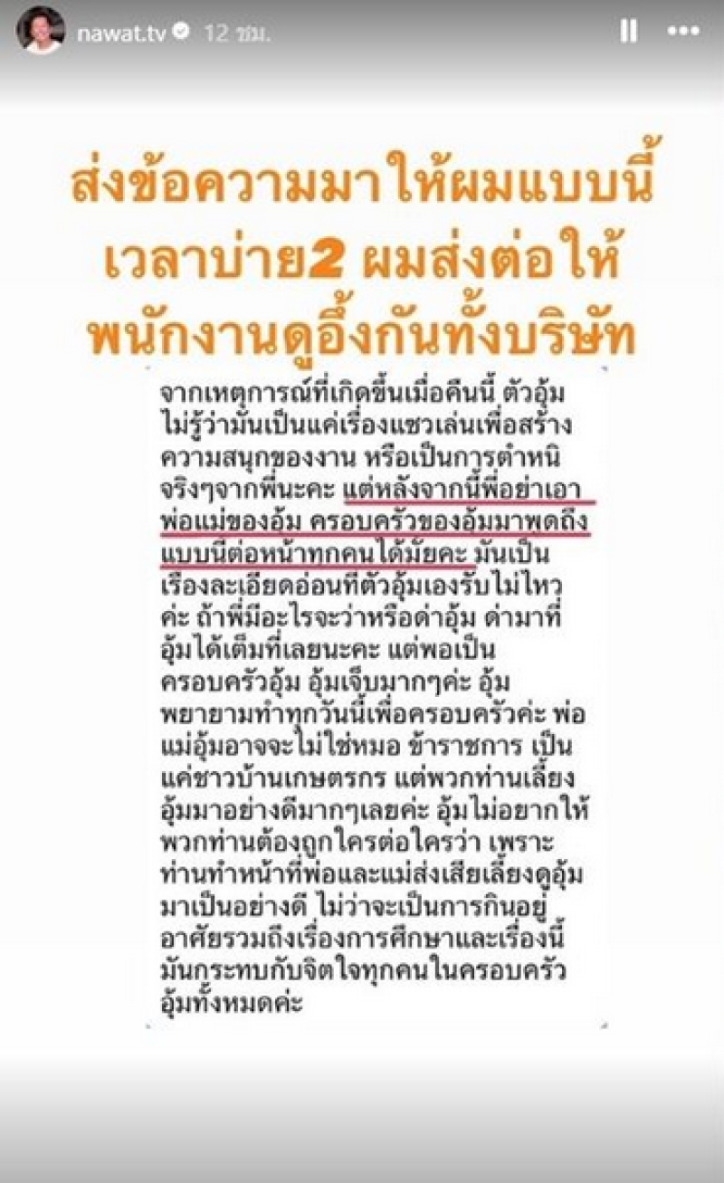 การพูดเรื่องของคุณพ่อคุณแม่คือการยกย่อง พ่อแม่ผมก็ยากจนมาจากชาวสวนภูมิใจทุกครั้งที่ได้พูดถึง แต่ถ้าพูดถึงไม่ได้แล้วไปปั่น ให้เป็นเรื่อง จากนี้ไปคงไม่อยากยุ่งและเกี่ยวข้องด้วยเพิ่งจะรู้ว่าแตะอะไรไม่ได้ โดย บอส ระบุ ส่งข้อความมาให้ผมแบบนี้ เวลาบ่าย2 ผมส่งต่อให้พนักงานดูอึ้งกันทั้งบริษัท พร้อมโพสต์ข้อความที่ อุ้ม ทวีพร ส่งมาว่า