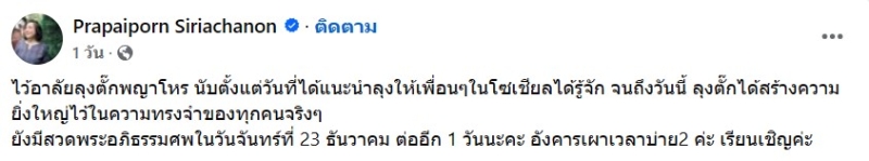 และทาง Prapaiporn Siriachanon ได้ออกมาเผยอีกว่า ไว้อาลัยลุงตั๊กพญาโหร นับตั้งแต่วันที่ได้แนะนำลุงให้เพื่อนๆในโซเชียลได้รู้จัก จนถึงวันนี้ ลุงตั๊กได้สร้างความยิ่งใหญ่ไว้ในความทรงจำของทุกคนจริงๆ ยังมีสวดพระอภิธรรมศพในวันจันทร์ที่ 23 ธันวาคม ต่ออีก 1 วันนะคะ อังคารเผาเวลาบ่าย2 ค่ะ เรียนเชิญค่ะ