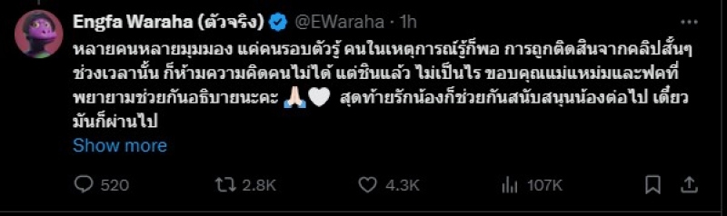 ล่าสุดอิงฟ้า ได้ออกมาเคลื่อนไหวผ่าน x แล้วว่า ก็แล้วแต่คนจะคิด พี่เต็มที่สุดๆแล้ว หลายคนหลายมุมมอง แค่คนรอบตัวรู้ คนในเหตุการณ์รู้ก็พอ การถูกตัดสินจากคลิปสั้นๆช่วงเวลานั้น ก็ห้ามความคิดคนไม่ได้ แต่ชินแล้ว ไม่เป็นไร ขอบคุณแม่แหม่มและฟคที่พยายามช่วยกันอธิบายนะคะ สุดท้ายรักน้องก็ช่วยกันสนับสนุนน้องต่อไป เดี๋ยวมันก็ผ่านไป น้องรู้อยู่แล้วว่าเป็นกำลังใจให้และหวังดีเสมอ