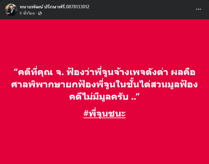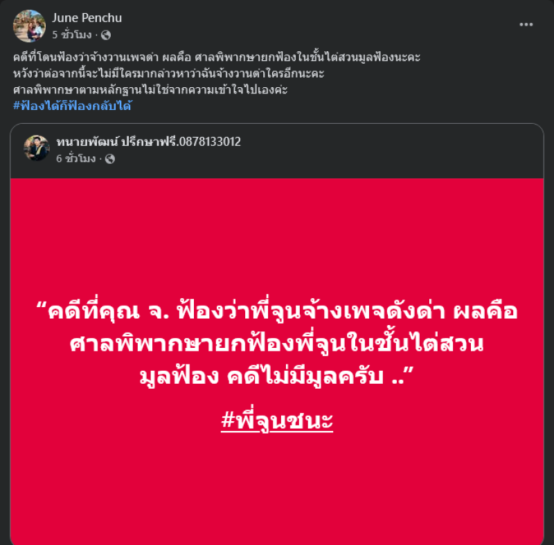 จากประเด็นที่ก่อนหน้านี้สืบเนื่องจากคดีที่ คุณ จ. คู่กรณีมือที่สามของ จูน เพ็ญชุลี และ หนุ่ม กะลา ได้ทำการฟ้องอ้างว่า จูน เพ็ญชุลี ได้ทำการจ้างเพจมาด่า ล่าสุดทางด้านทนายพัฒน์ ได้ออกมาโพสต์ข้อความผ่านเฟซบุ๊คทนายพัฒน์ ปรึกษาฟรี ว่า คดีที่คุณ จ. ฟ้องว่าพี่จูนจ้างเพจดังด่า ผลคือ ศาลพิพากษายกฟ้องพี่จูนในชั้นไต่สวนมูลฟ้อง คดีไม่มีมูลครับ #พี่จูนชนะ