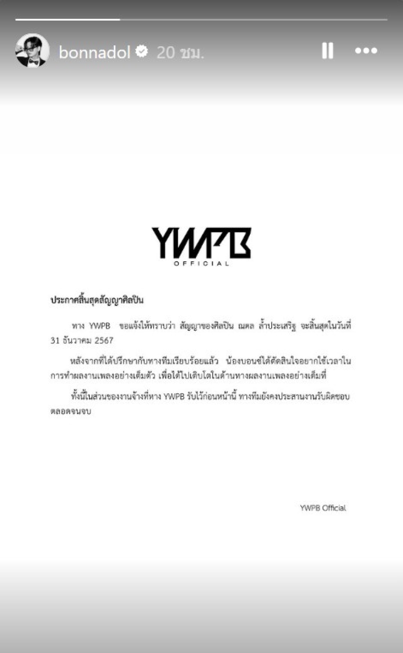ทาง YWPB ขอแจ้งให้ทราบว่า สัญญาของศิลปิน ณดล ล้ำประเสริฐ จะสิ้นสุดในวันที่ 31 ธันวาคม 2567 หลังจากที่ได้ปรึกษากับทางทีมเรียบร้อยแล้ว น้องบอนซ์ได้ตัดสินใจอยากใช้เวลาในการทำผลงานเพลงอย่างเต็มตัว เพื่อได้ไปเติบโตในด้านทางผลงานอย่างเต็มที่ ทั้งนี้ในส่วนของงานจ้างที่ทาง YWPB รับไว้ก่อนหน้านี้ ทางทีมยังคงประสานงานรับผิดชอบตลอดจนจบ