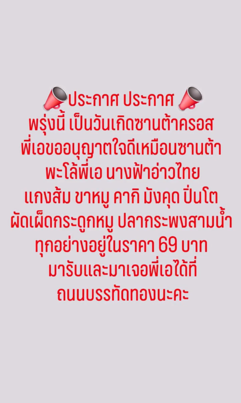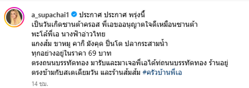 โดย พี่เอ ได้โพสต์ข้อความว่า ประกาศ ประกาศ พรุ่งนี้เป็นวันเกิดซานต้าครอส พี่เอขออนุญาตใจดีเหมือนซานต้า พะโล้พี่เอ นางฟ้าอ่าวไทย แกงส้ม ขาหมู คากิ มังคุด ปิ่นโต ผัดเผ็ดกระดูกหมู ปลากระพงสามน้ำ ทุกอย่างอยู่ในราคา 69 บาท มานรับและมาเจอพี่เอได้ที่ถนนบรรทัดทองนะคะ ร้านอยู่ตรงข้ามกับสเตเดียมวัน และร้านส้มส้ม #ครัวบ้านพี่เอ