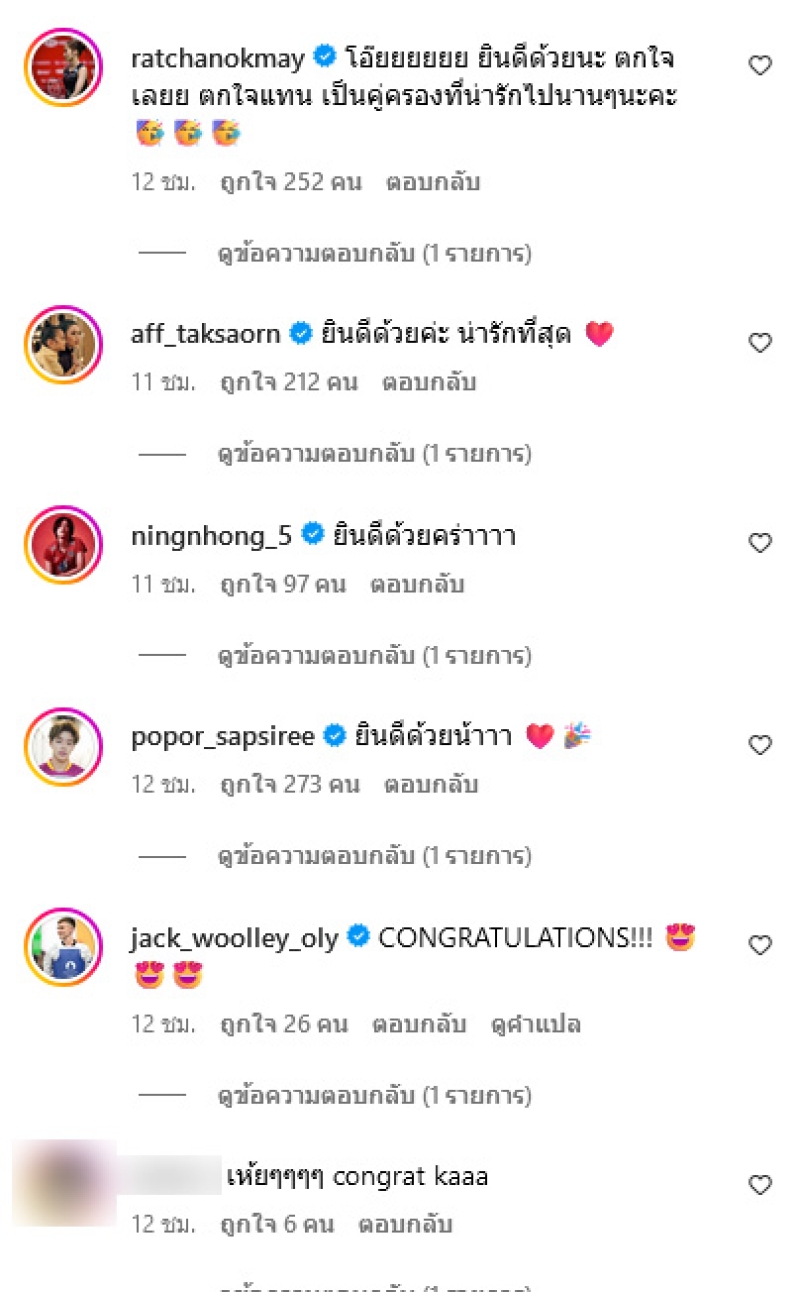 ท่ามกลางแฟนๆเเละคนในวงการแห่คอมเมนต์แสดงความยินดีเพียบ อาทิ โอ๊ยยยยยย ยินดีด้วยนะ ตกใจเลยย ตกใจแทน เป็นคู่ครองที่น่ารักไปนานๆนะคะ,ยินดีด้วยค่ะ น่ารักที่สุด,เห้ยๆๆๆๆ congrat kaaa,ยินดีด้วยนะคะ น่ารักมากๆ เลย,ว้าววว ยินดีด้วย เป็นต้น