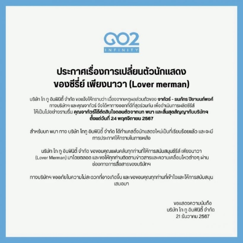 โดยเผยว่า บริษัท โก ทู อินฟินิตี้ จำกัด ได้แจ้งผ่านโซเชียลมีเดียว่า จากัวร์ตัดสินใจถอนตัวจากบท "พนา" ด้วยเหตุผลส่วนตัว และสิ้นสุดสัญญากับบริษัทตั้งแต่วันที่ 24 พฤศจิกายน 2567 โดยมีการแคสติ้งนักแสดงใหม่แล้ว ซึ่งจะมีการประกาศในภายหลัง