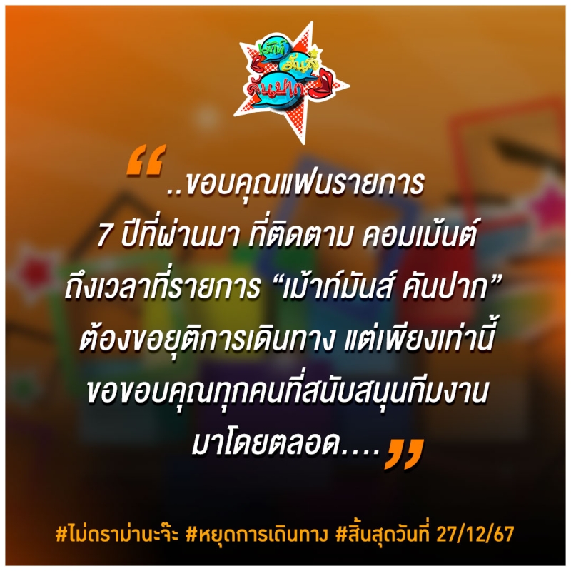 พร้อมเขียนข้อความว่า ขอบคุณแฟนรายการ 7 ปีที่ผ่านมา ที่ติดตาม คอมเมนต์ ถึงเวลาที่รายการ เม้าท์มันส์ คันปาก ต้องขอยุติการเดินทางแต่เพียงเท่านี้ ขอขอบคุณทุกคนที่สนับสนุนทีมงานมาโดยตลอด พร้อมติดแฮชแท็ก ดังนี้ #ไม่ดราม่านะจ๊ะ #หยุดการเดินทาง #สิ้นสุดวันที่27/12/67