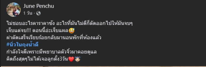 พร้อมระบุข้อความว่า ไม่ชอบอะไรคาราคาซัง อะไรที่มันไม่ดีก็ตัดออกไปให้มันจบๆ เจ็บแต่จบ!!! ตอนนี้อ่ะเจ็บแผล ผ่าตัดเสร็จเรียบร้อยกลับมานอนพักที่ห้องแล้ว #นิ่วในถุงน้ำดี กำลังใจดีเพราะมีพยาบาลตัวจิ๋วมาคอยดูแลคิดถึงสุดๆไม่ได้เจอลูกตั้ง3วัน ท่ามกลางแฟนๆต่างส่งกำลังใจกันอย่างมาก