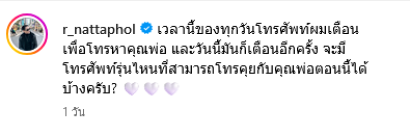 พร้อมทั้งยังเผยคลิปวินาทีร้องเพลงต่อหน้ารูปคุณพ่อ เขียนข้อความไว้ว่า เพลงนี้นอกจากเป็นเพลงที่พ่อชอบมากๆ แล้ว ยังเป็นเพลงที่เราร้องด้วยกันครั้งแรกในชีวิต พ่อจำได้ไหมครับ ท่ามกลางแฟนๆและเพื่อนในวงการต่างคอมเมนต์ส่งกำลังใจให้กันอย่างมาก