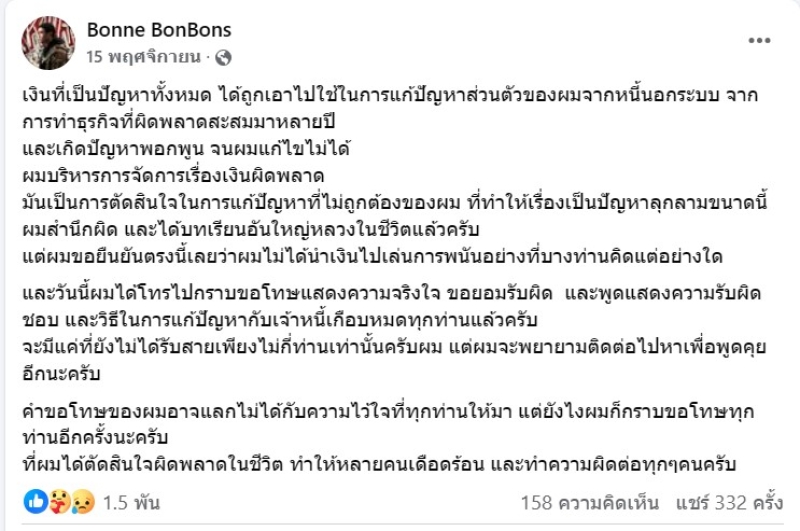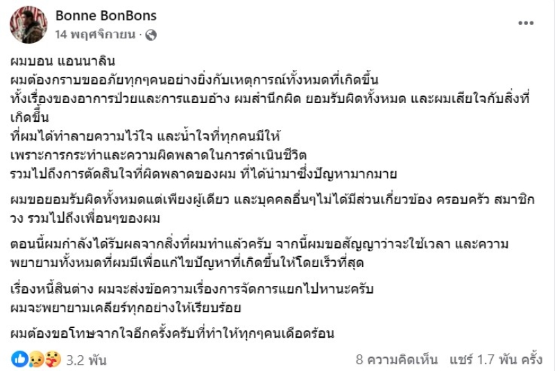 จากกรณีที่ก่อนหน้านั้น บอน หรือ นายณัฐพล ปุณยนภากุล วงร็อกไทย ANNALYNN ได้ออกมาโพสต์ยอมรับ กรณีหลอกเพื่อนร่วมวง แฟนคลับว่าป่วยมะเร็งกระเพาะอาหาร โดยเจ้าตัวยอมรับว่าทั้งหมดเป็นการกุเรื่องโกหกขึ้นมา เพื่อ นําเงินจากการขายเสื้อที่ระบุไว้ว่า จะใช้เป็นค่ารักษาตัวไปใช้หนี้นอกระบบแทน สัญญาว่าจะใช้หาเงินมาคืนเจ้าหนี้ทุกคนต่อไป พร้อมให้คํามั่น