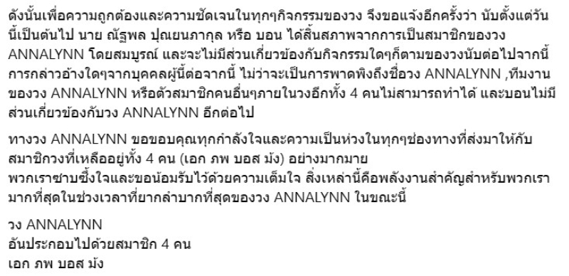 ดังนั้นเพื่อความถูกต้องและความชัดเจนในทุกๆกิจกรรมของวง จึงขอแจ้งอีกครั้งว่า นับตั้งแต่วันนี้เป็นต้นไป นาย ณัฐพล ปุณยนภากุล หรือ บอน ได้สิ้นสภาพจากการเป็นสมาชิกของวง ANNALYNN โดยสมบูรณ์ และจะไม่มีส่วนเกี่ยวข้องกับกิจกรรมใดๆก็ตามของวงนับต่อไปจากนี้ การกล่าวอ้างใดๆจากบุคคลผู้นี้ต่อจากนี้ ไม่ว่าจะเป็นการพาดพิงถึงชื่อวง ANNALYNN ,ทีมงานของวง ANNALYNN หรือตัวสมาชิกคนอื่นๆภายในวงอีกทั้ง 4 คนไม่สามารถทำได้ และบอนไม่มีส่วนเกี่ยวข้องกับวง ANNALYNN อีกต่อไป
